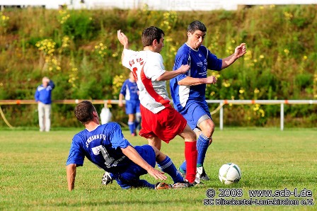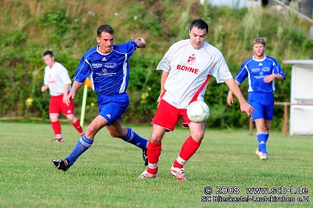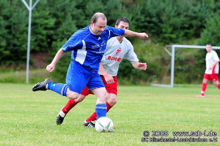 Nach der Pause dann das für Vorbereitungsspiele überliche Bild: Beide Seiten wechselten und so litt der Spielfluss sowohl beim SC als auch beim TuS merklich. Trotzdem waren die Hausherren das agiliere Team und überraschten den in der Rückwärtsbewegung lahmenden SC immer wieder mit schnell vorgetragenen Gegenstößen, mit denen der SC sichtlich Probleme hatte. So kam es auch wie es kommen musste: Ein TuS-Akteur kommt frei zu Flanken und eine tolle Direktabnahme landet im Tor des SC. Nur zwei Minuten später dann aber wieder Hoffnung beim SC: Der just eingewechselte Martin Glasner legt mustergültig auf Flavio Baier, der wenig Mühe hat zum 3:2 einzunetzen. Auf beiden Seiten entwickelte sich nun ein muteres Vergeben von Tormöglichkeiten: Robert Harder war es, der den SC mit drei tollen Paraden in der Partie hielt, bevor aus Blieskastel zwei hochkaräter auf der Strecke lies. Am Ende war es ein Foulelfmeter, der die Entscheidung bringen sollte: Vier Minuten vor dem Ende erzielte der TuS das 4:2 und entschied die Partie endgültig.