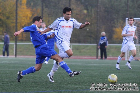 Im Heimspiel gegen den SV Schwarzenbach waren es von der ersten Minute an die Gäste, die das Spiel bestimmte. Schwarzenbach kontrollierte das Spiel und der Defensive SC konnte kaum einmal für Entlastung sorgen. Lediglich Torchancen waren zunächst Mangelware. Dann aber war es der SV, der das Gehäuse von SC-Schlussmann Matthias Schößer immer mehr unter Beschuss nahm, während Blieskastel nur ein einziges Mal durch Baier gefährlich vor das Tor des Gegners kam. So war es verdient, als Werner Heiler nach 19 Minuten aus 16 Metern mit einem platzierten Schuss das verdiente 1:0 erzielte. Blieskastel blieb die Antwort auf den Rückschlag schuldig und igelte sich weiter ohne eigene Offensivaktionen in der Defensive ein. Das Aufbauspiel des SC wurde von den Gästen zumeist schon im Keim erstickt. In der 33. Minute dann eine Vorentscheidung, als eine Freistoßflanke in den SC 16er segelt und Blieskastel das 2:0 durch ein Eigentor selbst besorgt. Nach dem 2:0 war der SC zwar bemüht selbst offensiv tätig zu werden scheiterte aber in seinen Bemühungen. So blieb es zur Pause bei der hochverdienten 2:0-Führung für die Gäste.