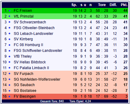 Der FC Freisen behauptet mit 44 Punkten die Tabellenführung und weist ein Torverhältnis von 58:28 auf. Die SG Bostalsee bleibt mit 7 Punkten auf dem 15. Tabellenplatz und kommt auf ein Torverhältnis von 24:52.