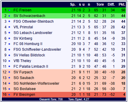 Der FC Freisen behauptet mit nun 50 Punkten und einem Torverhältnis von 65:31 die Tabellenführung. Der SV Schwarzenbach bleibt trotz der Niederlage mit 44 Punkten und 62:31 Toren auf dem 2. Platz.